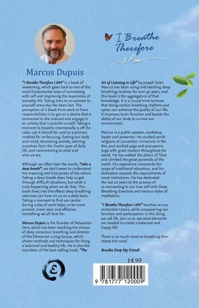 Marcus Dupuis is the founder of Relaxation One, teaching the virtues of deep conscious breathing, and director of the Elemental Living Group, which shares methods and techniques for living a balanced and healthy life. He is also the translator of the best-selling book, "The Art of Listening to Life" by Joseph Soler. Marcus has been using and teaching deep breathing routines for over 30 years, and this book is the aggregation of that knowledge. It is a crucial time to know how breathing rhythms and cycles can enhance the quality of our life. It improves brain function and boosts the ability of our body to survive our environment. Marcus is a public speaker, workshop leader and presenter. He studied world religions at Laurentian University in the 80s, and studied yoga and pranayama yoga with great masters throughout the world. He has walked the high plains of the Himalaya and climbed the great pyramids of the world. His experience transcends the scope of traditional education, and his dedication exceeds the requirements of most institutions. He has dedicated the last 20 years to the process of re-connecting to our true self with Deep Breathing Exercises and meditation. "I Breathe Therefore I AM" touches on our existential nature, while empowering our function and participation in this thing we call life. Join us to see what elements are needed to create a balanced and happy life! There is so much more to breathing than meets the nose! Breathe Deep My Friend!