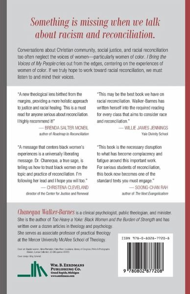 Disrupting the racist and sexist biases in conversations on reconciliation Chanequa Walker-Barnes offers a compelling argument that the Christian racial reconciliation movement is incapable of responding to modern-day racism. She demonstrates how reconciliation's roots in the evangelical, male-centered Promise Keepers' movement has resulted in a patriarchal and largely symbolic effort, focused upon improving relationships between men from various racial-ethnic groups. Walker-Barnes argues that highlighting the voices of women of color is critical to developing any genuine efforts toward reconciliation. Drawing upon intersectionality theory and critical race studies, she demonstrates how living at the intersection of racism and sexism exposes women of color to unique experiences of gendered racism that are not about relationships, but rather are about systems of power and inequity. Refuting the idea that race and racism are "one-size-fits-all," I Bring the Voices of My People highlights the particular work that White Americans must do to repent of racism and to work toward racial justice and offers a constructive view of reconciliation that prioritizes eliminating racial injustice and healing the damage that it has done to African Americans and other people of color.
