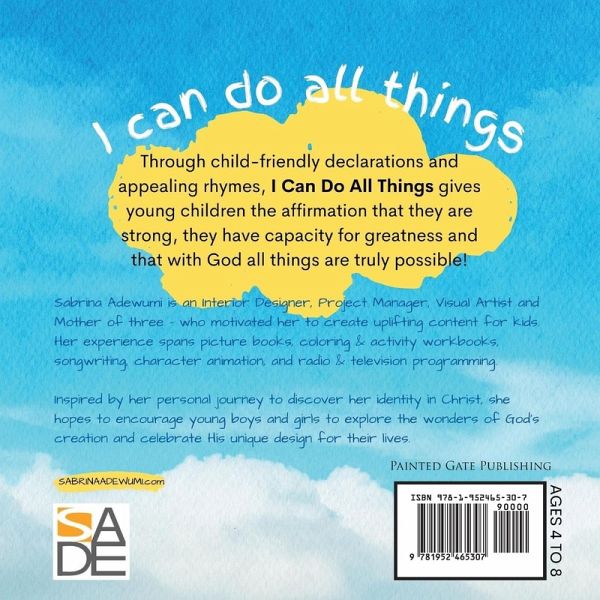I Can Do All Things The Word of God is a source of affirmation and encouragement, particularly for young children still discovering who they are. Verses such as PHILIPPIANS 4:13 - "I can do all things through Christ, because He gives me strength" - remind us to be bold and unafraid when we face challenges and new situations, because God is with us and has promised to help us. Through child-friendly declarations and appealing rhymes, I Can Do All Things gives young children the affirmation that they are strong, they have capacity for greatness and that with God all things are truly possible! "With God at my side and faith in my heart - nothing is impossible for me!" As part of an introductory collection by the author, I Can Do All Things is filled with declarations inspired by and pulled directly from passages in the Bible. Whether read aloud with a parent, memorized as simple poetry or translated into song, these declarations will be enjoyed over and over again, helping children to understand and appreciate God's design. Simple language combined with rich vocabulary supports the needs of emerging readers, while carefully-selected imagery, diverse portraits and graphics in a hand-drawn style, provide a relatable reference for young children of any background. ABOUT THE AUTHOR Sabrina Adewumi is an Interior Designer, Project Manager, Visual Artist and Mother of three - who motivated her to create uplifting content for kids. Her experience spans picture books, coloring & activity workbooks, songwriting, character animation, and radio & television programming. Inspired by her personal journey to discover her identity in Christ, she hopes to encourage young boys and girls to explore the wonders of God's creation and celebrate His unique design for their lives.