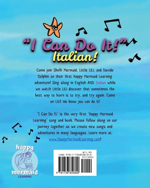 Immerse yourself in the enchanting world of Happy Mermaid Learning with: "I Can Do It-Italian!", the bilingual version of our original English-only book "I Can Do It!". Join Shelli Mermaid, Little LiLi, and Davide Dolphin as they embark on their first Happy Mermaid Learning adventure, singing and learning in both English AND Italian. Little LiLi is an independent girl learning to do things by herself. She may be a little mermaid, but she knows she can do it! Follow Little LiLi's journey as she discovers the power of perseverance and how trying again and again can lead to success. "I Can Do It-Italian" is just the beginning of Happy Mermaid Learning's bilingual adventures. Keep an eye out for more exciting songs and stories in multiple languages! Be sure to check out our website, www.HappyMermaidLearning.com, for additional ways to learn and have fun with us.