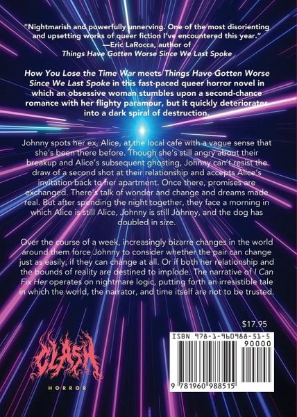How You Lose the Time War meets Things Have Gotten Worse Since We Last Spoke in this fast-paced queer horror novel in which an obsessive woman stumbles upon a second-chance romance with her flighty paramour, but it quickly deteriorates into a dark spiral of destruction. Johnny spots her ex, Alice, at the local cafe with a vague sense that she's been there before. Though she’s still angry about their breakup and Alice’s subsequent ghosting, Johnny can’t resist the draw of a second shot at their relationship and accepts Alice’s invitation back to her apartment. Once there, promises are exchanged. There’s talk of wonder and change and dreams made real. But after spending the night together, they face a morning in which Alice is still Alice, Johnny is still Johnny, and the dog has doubled in size. Over the course of a week, increasingly bizarre changes in the world around them force Johnny to consider whether the pair can change just as easily, if they can change at all. Or if both her relationship and the bounds of reality are destined to implode. The narrative of I Can Fix Her operates on nightmare logic, putting forth an irresistible tale in which the world, the narrator, and time itself are not to be trusted.