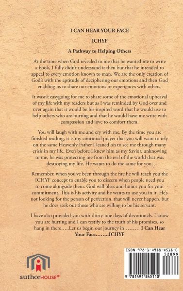 ABOUT THE BOOK God has spoken to me on numerous occasions in reference to the title of the book. I even shared the concept with a visiting pastor, perhaps making it a sermon, but to no avail. I had felt it had fallen on deaf ears. But, later, I knew that was part of God's plan. When the idea of "ICHYF", (I Can Hear Your Face), was conceived in my heart and spirit, it became alive and burned within my soul and then it came, my Heavenly Father spoke to me: "I choose you; I am the one who inspired and planted the seed in your heart. I am the one keeping this concept alive. I nourished it continually. Write it down my daughter. I will give you the inspiration to write the words as coming from me. Live through them my daughter, make my words come alive. It pleases me that you are willing to obey me. Remember my words when I said that I know you have little strength, you've tried your best to keep my word and you have not denied my name. These words will be my testimony of the truth. I cannot deny my own name." That which was first conceived in my spirit and my heart, ICHYF, really isn't anything new, but it is speaking to a new audience perhaps because of a generational gap in coming from a solid Christian home. All the trials, heartaches, much pain in my life, God has worked out for good. What he has and is doing in my life, he will do for you. Listen for God to whisper how much he loves you at the turn of every page. All through the writing process, I prayed for each one of you, my readers that you will be truly be blessed by our Abba Father.