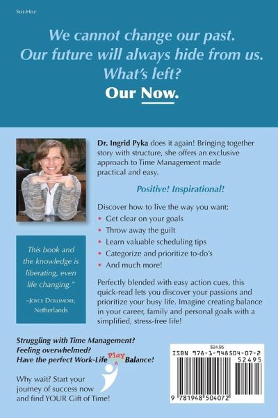 Struggling with Time Management? Feeling overwhelmed? Have the perfect Wok-Life-Play Balance! Why wait? Start your journey of success now and find YOUR Gift of Time! Author of the multi-award-winning book, Stop! Step Back & GROW, Dr. Ingrid Pyka does it again! Bringing together story with structure, she offers an exclusive approach to Time Management made practical and easy. Positive! Inspirational!Discover how to live the way you want: Get clear on your goals Throw away the guilt Learn valuable scheduling tips Categorize and prioritize to-do's And much more! Perfectly blended with easy action cues, this quick-read lets you discover your passions and prioritize your busy life. Imagine creating balance in your career, family and personal goals with a simplified, stress-free life! "This book and the knowledge is liberating, even life changing." -JOYCE DOLLIMORE, Netherlands We cannot change our past. Our future will always hide from us. What's left? Our Now.