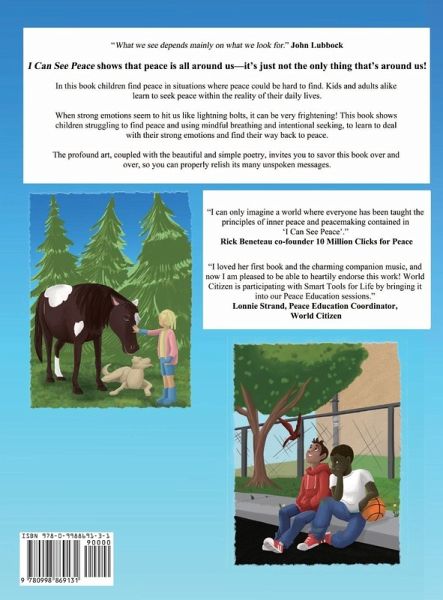 This award-winning, multicultural children's book won the Gold Medal in the "Health" category and is the Indie Human Relations Peace book of the Year (2018), surpassing adult's and children's books. It shows that even a child with arguing parents, severe illness, or in conflict with bully, can find ways back to peace and can restore mental health. In situations where peace could be hard to find, children learn to seek peace using mindful breathing, meditation, conflict resolution and more. Realistic scenarios help children believe that peace can be found if they seek it. This book is a profound visual and inspirational journey for children. Jeanine-Jonee Keith has drawn children of all sorts of ethnic backgrounds appreciating the planet's wonderful beauty, even when they are surrounded by poverty, personal challenges, or interpersonal conflict. The book merits many readings, as the pictures say much more than the words alone. Children learn that peace is all around them and can be found in some unexpected places. Sometimes it can be difficult to see peace, but even when it is interrupted, "I have the power and the wisdom to seek the tools to solve things peacefully." When strong emotions hit us like lightning bolts, it can be very frightening. This book shows children in traumatic situations others can relate to, learning to deal with their strong emotions and get back to peace. The included parent and teacher guide helps adults and children gain a deeper understanding of the concepts. The music notation for the "I Smile at Myself" song is included.