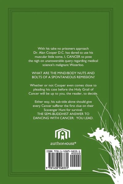 With his take no prisoners approach Dr. Alan Cooper D.C. has dared to use his muscular little tome, I, CANCER to pose the nigh on unanswerable query regarding medical science's malignant Waterloo. WHAT ARE THE MIND/BODY NUTS AND BOLTS OF A SPONTANEOUS REMISSION? Whether or not Cooper even comes close to pleading his case before the Holy Grail of Cancer will be up to you, the reader, to decide. Either way, his sub-title alone should give every Cancer sufferer the first clue on their Scavenger Hunt for survival. THE SEMI-BUDDHIST ANSWER TO DANCING WITH CANCER: YOU LEAD.