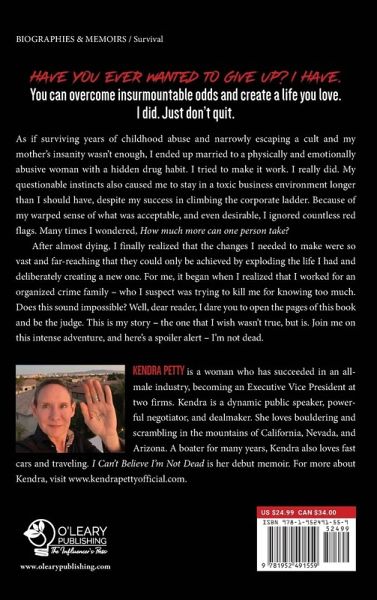 Have you ever wanted to give up? I have. You can overcome insurmountable odds and create a life you love. I did. Just don't quit. As if surviving years of childhood abuse and narrowly escaping a cult and my mother's insanity wasn't enough, I ended up married to a physically and emotionally abusive woman with a hidden drug habit. I tried to make it work. I really did. Despite my success in climbing the corporate ladder my questionable instincts caused me to stay in a toxic business environment longer than I should have. Because of my warped sense of what was acceptable, and even desirable, I ignored countless red flags. Many times I wondered, How much more can one person take? After almost dying, I finally realized that the changes I needed to make were so vast and far-reaching that they could only be achieved by exploding the life I had and deliberately creating a new one. For me, it began when I realized that I worked for an organized crime family - who I suspect was trying to kill me for knowing too much. Does this sound impossible? Well, dear reader, I dare you to open the pages of this book and be the judge. This is my story - the one that I wish wasn't true, but is. Join me on this intense adventure, and here's a spoiler alert - I'm not dead.