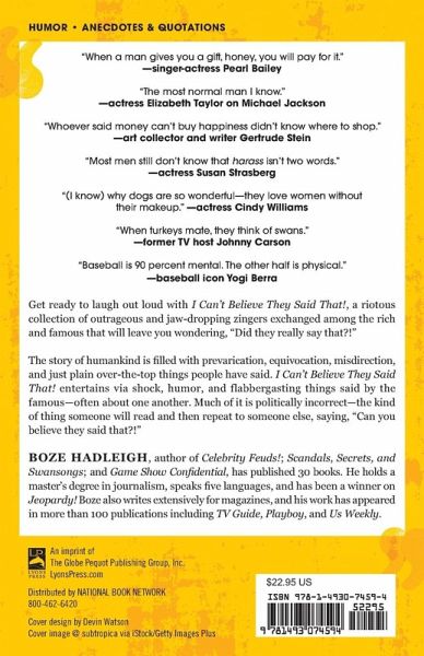 Get ready to laugh out loud with I Can't Believe They Said That!, a riotous collection of the most outrageous and jaw-dropping zingers exchanged among the rich and famous that will leave you wondering, "Did they really just say that?!" The story of humankind has been filled with prevarication, equivocation, misdirection, and just plain over-the-top things people have said. I Can’t Believe They Said That! entertains via shock and humor and flabbergasting things famous people have said—often about each other. Much of it is politically incorrect— the kind of thing someone will read and then repeat to someone else, saying, "Can you believe they said that?!"