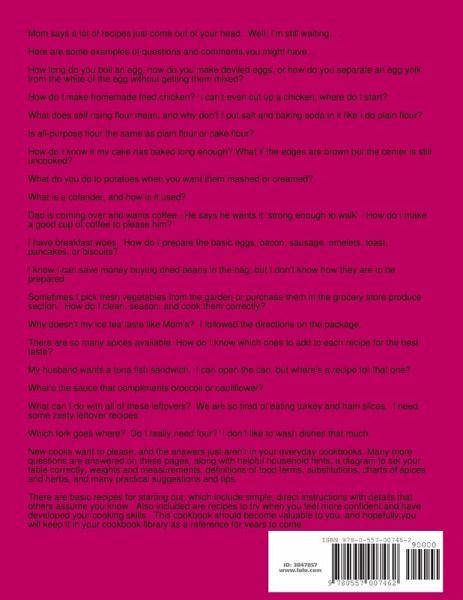 Most cookbooks take for granted you will know all of the basic steps in preparing a meal. Since you don't have a magic genie at your disposal you end up calling mom, if you are lucky enough to still have her. This cookbook includes basic things and helpful hints every bride or new cook needs to know. It is also written for any one away from home for the first time, such as students, or those living in that first apartment. Bachelors or newly divorced guys will benefit from the recipes and ideas. You can all learn to cook like a pro using simple, easy to follow instructions.