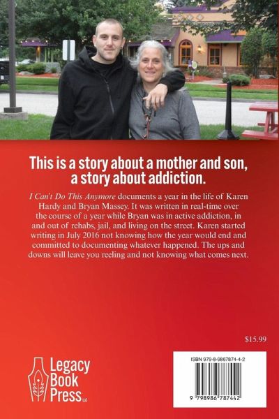 This is a story about a mother and son, a story about addiction. I Can't Do This Anymore documents a year in the life of Karen Hardy and Bryan Massey. It was written in real-time over the course of a year while Bryan was in active addiction, in and out of rehabs, jail, and living on the street. Karen started writing in July 2016 not knowing how the year would end and committed to documenting whatever happened. The ups and downs will leave you reeling and not knowing what comes next.