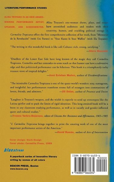 Alina Troyano's one-woman shows, plays, and essays have astonished audiences and readers with their creativity, humor, and crackling political energy. I, Carmelita Tropicana offers the first comprehensive collection of her work, from "Memorias de la Revolución" (with Uzi Parnes) to "Your Kunst is Your Waffen" (with Ela Troyano).