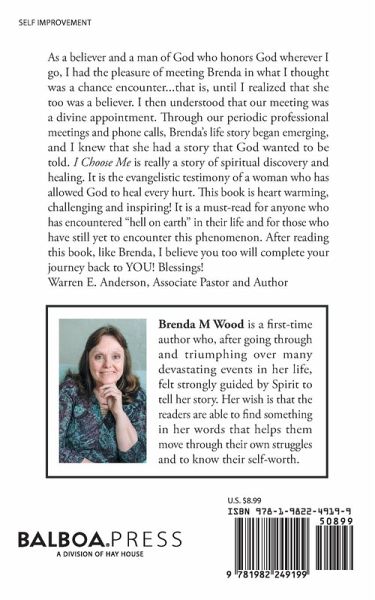 As a believer and a man of God who honors God wherever I go, I had the pleasure of meeting Brenda in what I thought was a chance encounter...that is, until I realized that she too was a believer. I then understood that our meeting was a divine appointment. Through our periodic professional meetings and phone calls, Brenda's life story began emerging, and I knew that she had a story that God wanted to be told. I Choose Me is really a story of spiritual discovery and healing. It is the evangelistic testimony of a woman who has allowed God to heal every hurt. This book is heart warming, challenging and inspiring! It is a must-read for anyone who has encountered "hell on earth" in their life and for those who have still yet to encounter this phenomenon. After reading this book, like Brenda, I believe you too will complete your journey back to YOU! Blessings! Warren E. Anderson, Associate Pastor and Author