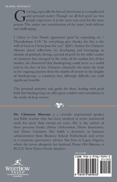 Grieving, especially the loss of a loved one, is a complicated and personal matter. Though we all feel grief, no two people experience it in the same way, even for the same person. This makes any consideration of the topic, both delicate and challenging. I Choose to Give Thanks approaches grief by expanding on 1 Thessalonians 5:18: "In everything give thanks; for this is the will of God in Christ Jesus for you" (KJV). Author Dr. Chinyere Almona shares reflections on developing and leveraging an attitude of gratitude during a period of grief. In the roller coaster of emotions that emerged in the wake of the sudden loss of her mother, she discovered that thanksgiving could serve as a useful tool in the face of loss. Chinyere chronicles the route she took in her ongoing journey from the depths of sorrow to the heights of thanksgiving-a transition that, although difficult, can yield significant benefits. This personal narrative and guide for those dealing with grief hold that thanksgiving can offer great comfort and consolation in the midst of deep sorrow.