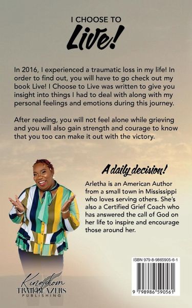 In 2016, I experienced a traumatic loss in my life! In order to find out, you will have to go check out my book Live! I Choose to Live was written to give you insight into things I had to deal with along with my personal feelings and emotions during this journey.After reading, you will not feel alone while grieving and you will also gain strength and courage to know that you too can make it out with the victory.