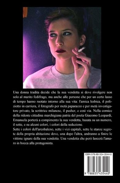 Una donna tradita decide che la sua vendetta si deve rivolgere non solo al marito fedifrago, ma anche alle persone che per un certo lasso di tempo hanno ruotato intorno alla sua vita: l'amica lesbica, il poliziotto in carriera, il fotografo per metà paparazzo e per metà investigatore privato, la scrittrice milanese, il pusher, e così via. Nella cornice della ridente cittadina marchigiana patria del poeta Giacomo Leopardi, Emanuela porterà a compimento la sua vendetta, basata su un numero, il sette, e su alcuni colori, i colori della seduzione. Sette i colori dell'arcobaleno, sette i vizi…mehr