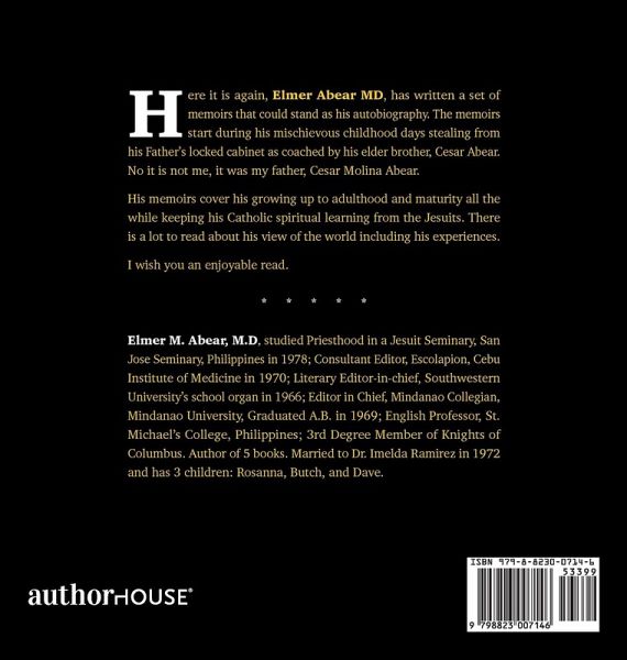 Here it is again, Elmer Abear MD, has written a set of memoirs that could stand as his autobiography. The memoirs start during his mischievous childhood days stealing from his Father's locked cabinet as coached by his elder brother, Cesar Abear. No it is not me, it was my father, Cesar Molina Abear. His memoirs cover his growing up to adulthood and maturity all the while keeping his Catholic spiritual learning from the Jesuits. There is a lot to read about his view of the world including his experiences. I wish you an enjoyable read.