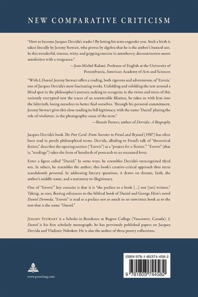 «With I, Daniel, Jeremy Stewart offers a reading, both rigorous and adventurous, of 'Envois,' one of Jacques Derrida's most fascinating works. Unfolding and refolding the text around a blind spot in the philosopher's journey, seeking to recognize in the twists and turns of this variously encrypted text the traces of an unutterable filiation, he takes us with him into the labyrinth, losing ourselves to better find ourselves. Through his personal commitment, Jeremy Stewart gives this close reading its full legitimacy, with the name 'Daniel' playing the role of révélateur, in the photographic sense of the term.»