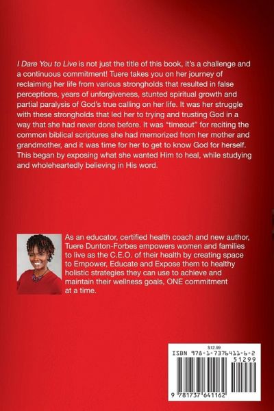 I Dare You to Live is not just the title of this book, it's a challenge and a continuous commitment! Tuere takes you on her journey of reclaiming her life from various strongholds that resulted in false perceptions, years of unforgiveness, stunted spiritual growth and partial paralysis of God's true calling on her life. It was her struggle with these strongholds that led her to trying and trusting God in a way that she had never done before. It was "timeout" for reciting the common biblical scriptures she had memorized from her mother and grandmother, and it was time for her to get to know God for herself. This began by exposing what she wanted Him to heal, while studying and wholeheartedly believing in His word.