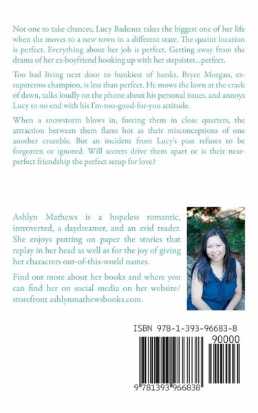 Not one to take chances, Lucy Badeaux takes the biggest one of her life when she moves to a new town in a different state. The quaint location is perfect. Everything about her job is perfect. Getting away from the drama of her ex-boyfriend hooking up with her stepsister...perfect. Too bad living next door to hunkiest of hunks, Bryce Morgan, ex-supercross champion, is less than perfect. He mows the lawn at the crack of dawn, talks loudly on the phone about his personal issues, and annoys Lucy to no end with his I'm-too-good-for-you attitude. When a snowstorm blows in, forcing them in close quarters, the attraction between them flares hot as their misconceptions of one another crumble. But an incident from Lucy's past refuses to be forgotten or ignored. Will secrets drive them apart or is their near-perfect friendship the perfect setup for love?