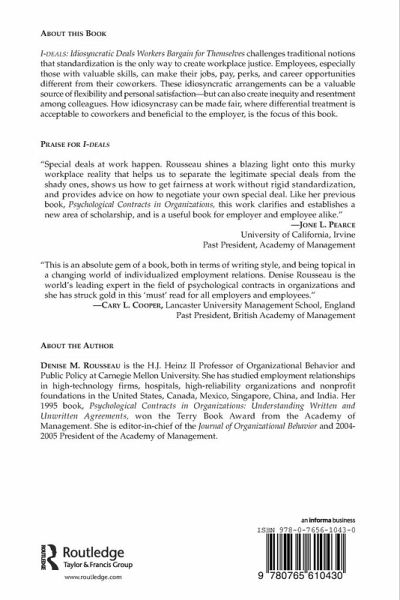 Employees with valuable skills and a sense of their own worth can make their jobs, pay, perks, and career opportunities different from those of their coworkers in subtle and not-so-subtle ways. Work at home arrangements, flexible hours, special projects - personally negotiated arrangements like these can be a valuable source of flexibility and personal satisfaction, but at the risk of creating inequality and resentment by other employees. This book shows how such individual arrangements can be made fair and acceptable to coworkers, and beneficial to both the employee and the employer. Written by the world's leading expert on the subject, I-deals: Idiosyncratic Deals Employees Bargain for Themselves challenges traditional notions that standardization is the way to create workplace justice. The book is filled with real examples, cases, and supporting data. It expands conventional ideas of workplace fairness, provides details on the power that workers influence over their employmentconditions, and spells out how employees and employers can channel this influence into mutually beneficial innovations. The book is "must reading" for students and scholars in the fields of human resource management and organizational behavior, and for managers and employees everywhere.