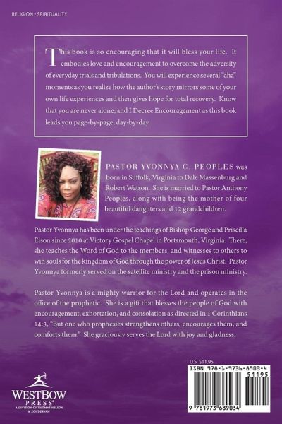 This book is so encouraging that it will bless your life. It embodies love and encouragement to overcome the adversity of everyday trials and tribulations. You will experience several "aha" moments as you realize how the author's story mirrors some of your own life experiences and then gives hope for total recovery. Know that you are never alone; and I Decree Encouragement as this book leads you page-by-page, day-by-day.