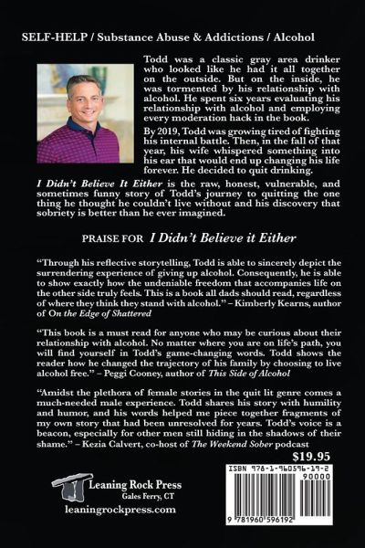 Todd was a classic gray area drinker who looked like he had it all together on the outside: a successful attorney, a nice house, a beautiful family. But on the inside, he was tormented by his relationship with alcohol. He loved drinking and being the life of the party, yet there was so much about drinking he didn't like: the control it had on him, how it consumed his every thought, and how he felt after drinking too much. He spent six years evaluating his relationship with alcohol and employing every moderation hack in the book. Some of them worked, but it was exhausting, and the victories were always short-lived. All the things he didn't like about drinking-they always came back. By 2019, Todd was growing tired of fighting his internal battle. He was worn down by the constant negotiating and obsessing, and was sick of the torment, shame, and regret. Then, in the fall of that year, his wife whispered something into his ear that would change his life forever. It was the last straw in a string of countless other incidents over several years-some tiny, some big, most somewhere in between-that finally tipped the scales for good. He decided to quit drinking. Giving up alcohol was scary and overwhelming. Even though Todd knew it was the right decision, he also thought life without alcohol would be a little dull and boring, a bit like a prison sentence for not being able to "drink like a normal person." What he discovered, however, was that giving it up was the farthest thing from a prison sentence. On the other side of alcohol was a life of deeper connection, richer fulfillment, and unending gratitude that he didn't even know existed. He found a sense of clarity and peace that he had never felt before. He discovered a new and better way of living that so far outweighs what alcohol ever gave him. He wishes he would have done it sooner. I Didn't Believe It Either is the raw, honest, vulnerable, and sometimes funny story of Todd's journey to quitting the one thing he thought he couldn't live without and his discovery that sobriety is better than he ever imagined.