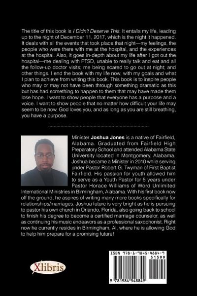 The title of this book is I Didn't Deserve This: The Shot That Brought Me Pain and Took Me to Purpose. It entails my life, leading up to the night of December 11, 2017, which is the night it happened. It deals with all the events that took place that night-my feelings, the people who were there with me at the hospital, and the experiences at the hospital. Also, it goes in-depth about my life after I got out of the hospital-me dealing with PTSD, unable to really talk and eat and all the follow-up doctor visits; me being scared to go out at night; and other things. I end the book with my life now, with my goals, and what I plan to achieve from writing this book. This book is to inspire people who may or may not have been through something dramatic as this but has had something to happen to them that may have made them lose hope. I want to show people that everyone has a purpose and a voice. I want to show people that no matter how difficult your life may seem to be now, God loves you, and as long as you are still breathing, you have a purpose.