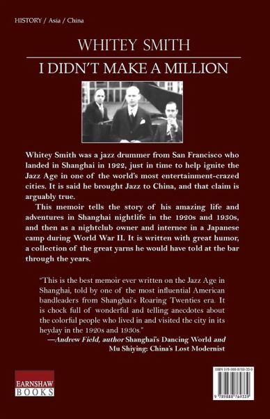 Whitey Smith was a jazz drummer from San Francisco who landed in Shanghai in 1922, just in time to help ignite the Jazz Age in one of the world's most entertainment-crazed cities. It is said he brought Jazz to China, and that claim is arguably true. This memoir tells the story of his amazing life and adventures in Shanghai nightlife in the 1920s and 1930s, and then as a nightclub owner and internee in a Japanese camp during World War II. It is written with great humor, a collection of the great yarns he would have told at the bar through the years.