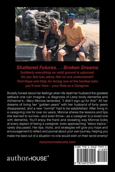 Brutally honest about her feelings when life dealt her husband the greatest setback one can imagine-a diagnosis of Lewy body dementia and Alzheimer's-Mary Monroe lamented, "I didn't sign up for this!" All her dreams of living her "golden years" with her husband of forty years disappeared, and a new "normal" had to be established. After living in a caregiving role for over six years, Monroe shares the lessons and tips she learned to survive-and even thrive-as a caregiver to a loved one with dementia. You'll enjoy the frank and revealing way Monroe looks at every aspect of being a caregiver, even approaching "taboo topics," rarely discussed. Her tips, tricks, and strategies will give you hope and encouragement to reflect and journal about your own journey, helping you make the best out of a situation no one would wish on their worst enemy!