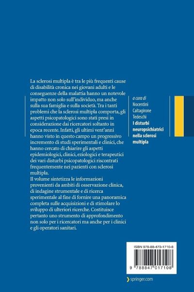 La sclerosi multipla è tra le più frequenti cause di disabilità cronica nei giovani adulti e le conseguenze della malattia hanno un notevole impatto non solo sull'individuo, ma anche sulla sua famiglia e sulla società. Tra i tanti problemi che la sclerosi multipla comporta, gli aspetti psicopatologici sono stati presi in considerazione dai ricercatori soltanto in epoca recente. Infatti, gli ultimi vent'anni hanno visto in questo campo un progressivo incremento di studi sperimentali e clinici, che hanno cercato di chiarire gli aspetti epidemiologici, clinici, eziologici e terapeutici dei vari disturbi psicopatologici riscontrati frequentemente nei pazienti con sclerosi multipla. Il volume sintetizza le informazioni provenienti da ambiti di osservazione clinica, di indagine strumentale e di ricerca sperimentale al fine di fornire una panoramica completa sulle acquisizioni e di stimolare lo sviluppo di ulteriori ricerche. Costituisce pertanto uno strumento di approfondimento non solo per i ricercatori ma anche per i clinici e gli operatori sanitari.