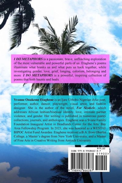 I DO METAPHORS is a passionate, brave, unflinching exploration of the most vulnerable and powerful parts of us. Etaghene's poems illuminate what breaks us and what puts us back together, while investigating gender, love, grief, longing, colorism, belonging and more. I DO METAPHORS is a powerful, inspiring collection of poems that both haunts and heals.