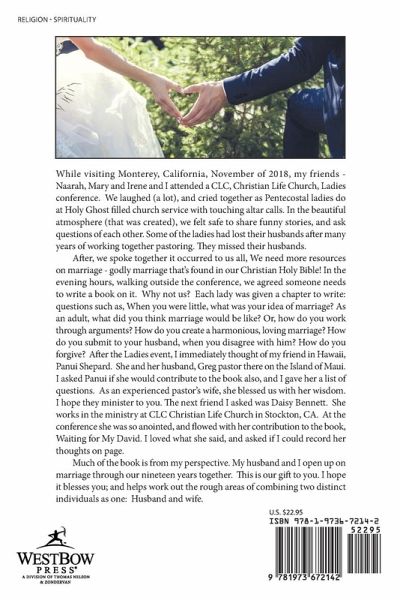 While visiting Monterey, California, November of 2018, my friends - Naarah, Mary and Irene and I attended a CLC, Christian Life Church, Ladies conference. We laughed (a lot), and cried together as Pentecostal ladies do at Holy Ghost filled church service with touching altar calls. In the beautiful atmosphere (that was created), we felt safe to share funny stories, and ask questions of each other. Some of the ladies had lost their husbands after many years of working together pastoring. They missed their husbands. After, we spoke together it occurred to us all, We need more resources on marriage - godly marriage that's found in our Christian Holy Bible! In the evening hours, walking outside the conference, we agreed someone needs to write a book on it. Why not us? Each lady was given a chapter to write: questions such as, When you were little, what was your idea of marriage? As an adult, what did you think marriage would be like? Or, how do you work through arguments? How do you create a harmonious, loving marriage? How do you submit to your husband, when you disagree with him? How do you forgive? After the Ladies event, I immediately thought of my friend in Hawaii, Panui Shepard. She and her husband, Greg pastor there on the Island of Maui. I asked Panui if she would contribute to the book also, and I gave her a list of questions. As an experienced pastor's wife, she blessed us with her wisdom. I hope they minister to you. The next friend I asked was Daisy Bennett. She works in the ministry at CLC Christian Life Church in Stockton, CA. At the conference she was so anointed, and flowed with her contribution to the book, Waiting for My David. I loved what she said, and asked if I could record her thoughts on page. Much of the book is from my perspective. My husband and I open up on marriage through our nineteen years together. This is our gift to you. I hope it blesses you; and helps work out the rough areas of combining two distinct individuals as one: Husband and wife.