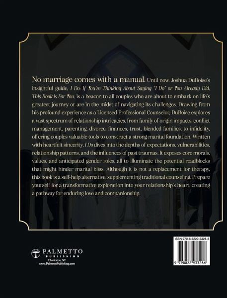 Secure Your Love: Joshua DuBoise's I Do helps couples, pre-marital and married, navigate their journeys with wisdom, empathy, and a depth of understanding. Dive into the intricacies of marriage with Joshua DuBoise's I Do: If You're Thinking About Saying "I Do" or You Already Did, This Book is For You. This transformative guide prepares couples, both pre-marital and already wedded, for the exciting yet challenging journey of marriage. DuBoise, a seasoned Licensed Professional Counselor, leverages his in-depth knowledge to shed light on critical subjects such as family origin impacts, communication, conflict management, parenting, divorce, finances, trust, and blended families, among others. This invaluable self-help book functions as a supplement to traditional counseling, providing you with tools and insights that will strengthen your bond and foster a harmonious relationship. Although it is not a replacement for therapy, I Do offers a hands-on approach to address and explore the complex dynamics of a marital relationship, assisting you in building a strong foundation that can weather any storm. Unlock the secrets to a successful, thriving marriage with I Do, fostering a relationship rooted in mutual understanding, compassion, and enduring love. Embark on your marital journey with confidence and assurance, knowing you have the wisdom of I Do at your fingertips.