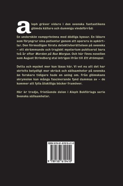 En underskön vampyrkvinna med dödliga kyssar. En läkare som föryngrar sina patienter genom att operera in apkörtlar. Den förmodligen första detektivberättelsen på svenska -- ett skrämmande och tragiskt mysterium publicerat bara två år efter Morden på Rue Morgue. Och här finns novellen som August Strindberg stal intrigen ifrån till Ett drömspel. Detta och mycket mer kan läsas här. Vi vet nu att det har skrivits betydligt mer skräck och sällsamheter på svenska än forskare tidigare hade en aning om. Från glömskans skrymslen kan många fascinerande fynd dammas av -- de kommer att fylla åtskilliga böcker framöver. Detta är tredje, fristående delen i Aleph Bokförlags serie Svenska sällsamheter.