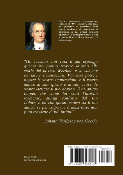 "Ho raccolto con cura e qui espongo quanto ho potuto trovare intorno alla storia del povero Werther, e so che me ne sarete riconoscenti. Voi non potrete negare la vostra ammirazione e il vostro amore al suo spirito e al suo cuore, le vostre lacrime al suo destino. E tu, anima buona, che come lui senti l'interno tormento, attingi conforto dal suo dolore, e fai che questo scritto sia il tuo amico, se per colpa tua o della sorte non puoi trovarne di più intimi." Johann Wolfgang von Goethe