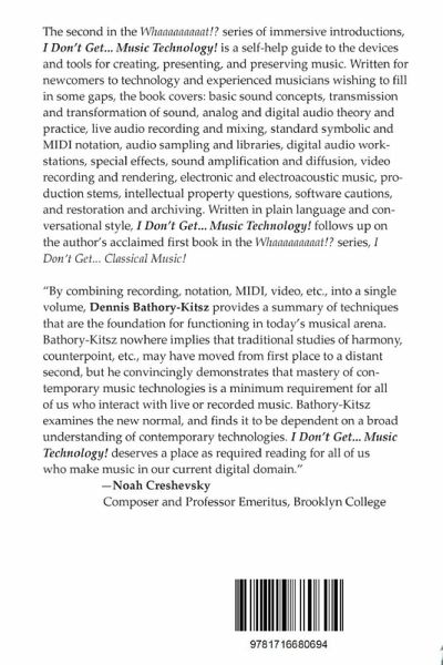 The second in the "Whaaaaaaaaat!?" series, "I Don't Get... Music Technology!" is an introductory self-help guide to the use of technology in music. It includes basic sound concepts, transmission and transformation of sound, digital audio theory and practice, live audio recording and mixing, standard symbolic and MIDI notation, audio sampling, digital audio workstations, special effects, sound diffusion, video recording and rendering, electronic and electroacoustic music, stems, intellectual property, software, and restoration and archiving. Written in plain language and conversational style, "I Don't Get..." follows up on the author's acclaimed "I Don't Get Classical Music" book.