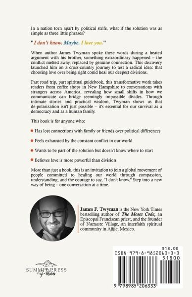 In a nation torn apart by political strife, what if the solution was as simple as three little phrases? "I don't know. Maybe. I love you." When author James Twyman spoke these words during a heated argument with his brother, something extraordinary happened - the conflict melted away, replaced by genuine connection. This discovery launched him on a cross-country journey to test a radical idea: that choosing love over being right could heal our deepest divisions. Part road trip, part spiritual guidebook, this transformative work takes readers from coffee shops in New Hampshire to conversations with strangers across America, revealing how small shifts in how we communicate can bridge seemingly impossible divides. Through intimate stories and practical wisdom, Twyman shows us that de-polarization isn't just possible - it's essential for our survival as a democracy and as a human family. This book is for anyone who:Has lost connections with family or friends over political differences Feels exhausted by the constant conflict in our world Wants to be part of the solution but doesn't know where to start Believes love is more powerful than division More than just a book, this is an invitation to join a global movement of people committed to healing our world through compassion, understanding, and the courage to say, "I don't know." Step into a new way of being - one conversation at a time.