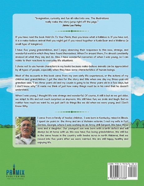 If you have read the book Hold On To Your Pants, then you know what a Kallaboo is. If you have not, it is a make-believe animal that you might get if you mixed together a Koala Bear and a Wallaroo (a small type of kangaroo). I have five young grandchildren, and I enjoy observing their responses to this new, strange, and wonderful world in which they have found themselves. When I'm around them, I'm almost constantly amazed at what they say and do. Also, I have wonderful memories of when I was young, so I can relate to their reactions to everyday life situations. I chose not to use human characters in my books because make-believe animals can be appreciated by all types of people, especially when they have some characteristics of human beings. Most of the accounts in this book came from my own early life experiences, or the actions of my children and grandchildren. I got the idea for the story and title when one day my three-year-old grandson said, "I am three years old and my cousin is going to be three years old in a few days, but I don't know why." It made me think of just how many things must be in his mind that he doesn't understand. When I was young, I thought life was strange and wonderful. Of course, it still is but as we get older, we adapt to life and not much surprises us anymore. We still have fun; we smile and laugh. But no matter how much we want to, we just can't do things like we did when we were young, and I Don't Know Why.