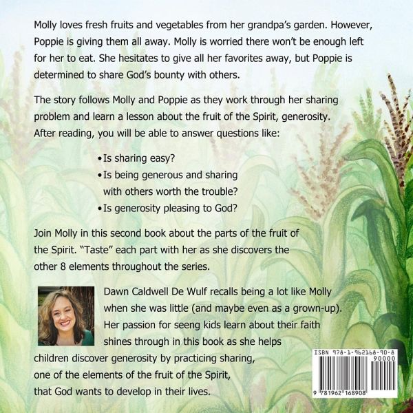 Molly loves fresh fruits and vegetables from her grandpa's garden. However, Poppie is giving them all away. Molly is worried there won't be enough left for her to eat. She hesitates to give all her favorites away, but Poppie is determined to share God's bounty with others. The story follows Molly and Poppie as they work through her sharing problem and learn a lesson about the fruit of the Spirit, generosity. After reading, you will be able to answer questions like: Is sharing easy?Is being generous and sharing with others worth the trouble?Is generosity pleasing to God? Join Molly in this second book about the parts of the fruit of the Spirit. "Taste" each part with her as she discovers the other 8 elements throughout the series.
