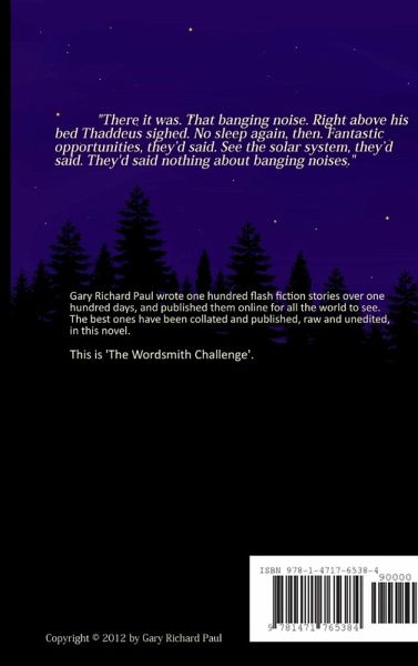 "There it was. That banging noise. Right above his bed. Thaddeus sighed. No sleep again, then. Fantastic opportunities, they'd said. See the solar system, they'd said. They'd said nothing about banging noises." Gary Richard Paul wrote one hundred flash fiction stories over one hundred days, and published them online for all the world to see. The best ones have been collated and published, raw and unedited, in this novel. This is 'The Wordsmith Challenge'.