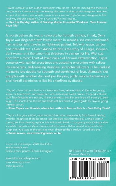 A month before she was to celebrate her fortieth birthday in Italy, Dena Taylor was diagnosed with breast cancer. In seconds, she was transformed from enthusiastic traveler to frightened patient. Told with grace, candor, and inimitable wit, I Don't Wanna Be Pink is the story of a single, independent woman and the tumor that threatens to change her life. With support from a colorful cast of loved ones and her own determination, Taylor contends with painful procedures and upsetting encounters with callous insurance reps, well-meaning strangers, and potential lovers. In her darkest moments, she doubts her strength and worthiness of love. Ultimately, she grapples with whether she must join the pink, public march of advocacy or give herself permission to live life undefined by disease.