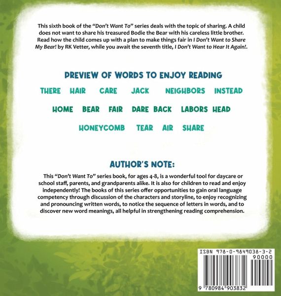 This sixth book of the "Don't Want To" series deals with the topic of sharing. A child does not want to share his treasured Bodie the Bear with his careless little brother. Read how the child comes up with a plan to make things fair in I Don't Want to Share My Bear! by RK Vetter, while you await the seventh title, I Don't Want to Hear It Again!. Author's Note: This "Don't Want To" series book, for ages 4-8+, is a wonderful tool for daycare or school staff, parents, and grandparents alike. It's also great for children to read and enjoy independently! The books of this series offer opportunities to gain oral language competency through discussion of the characters and storyline, to enjoy recognizing and pronouncing written words, to notice the sequence of letters in words, and to discover new word meanings, all helpful in strengthening reading comprehension. Look on the back cover of each book to see the Preview of Words to Enjoy Reading.