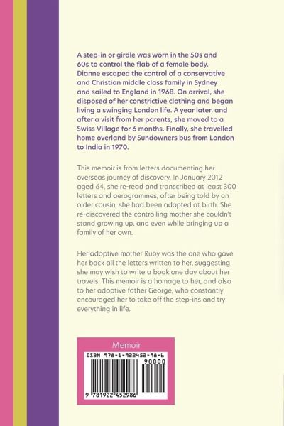 A step-in or girdle was worn in the 50s and 60s to control the flab of a female body. Dianne escaped the control of a conservative and Christian middle class family in Sydney and sailed to England in 1968. On arrival, she disposed of her constrictive clothing and began living a swinging London life. A year later, and after a visit from her parents, she moved to a Swiss Village for 6 months. Finally, she travelled home overland by Sundowners bus from London to India in 1970. This memoir is from letters documenting her overseas journey of discovery. In January 2012 aged 64, she re-read and transcribed at least 300 letters and aerogrammes, after being told by an older cousin, she had been adopted at birth. She re-discovered the controlling mother she couldn't stand growing up, and even while bringing up a family of her own. Her adoptive mother Ruby was the one who gave her back all the letters written to her, suggesting she may wish to write a book one day about her travels. This memoir is a homage to her, and also to her adoptive father George, who constantly encouraged her to take off the step-ins and try everything in life.