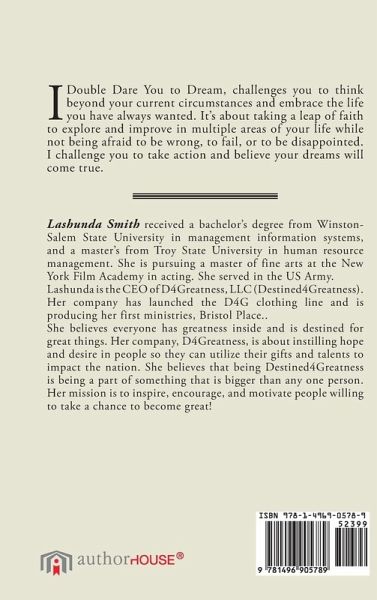 I Double Dare You to Dream, challenges you to think beyond your current circumstances and embrace the life you have always wanted. It's about taking a leap of faith to explore and improve in multiple areas of your life while not being afraid to be wrong, to fail, or to be disappointed. I challenge you to take action and believe your dreams will come true.