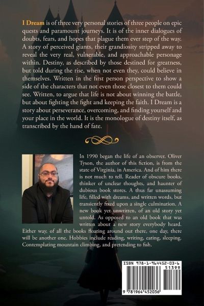 I Dream is of three very personal stories of three people on epic quests and paramount journeys. It is of the inner dialogues of doubts, fears, and hopes that plague them ever step of the way. A story of perceived giants, their grandiosity stripped away to reveal the very real, vulnerable, and approachable personage within. Destiny, as described by those destined for greatness, but told during the rise, when not even they, could believe in themselves. Written in the first person perspective to show a side of the characters that not even those closest to them could see. Written, to argue that life is not about winning the battle, but about fighting the fight and keeping the faith. I Dream is a story about perseverance, overcoming, and finding yourself and your place in the world. It is the monologue of destiny itself, as transcribed by the hand of fate.