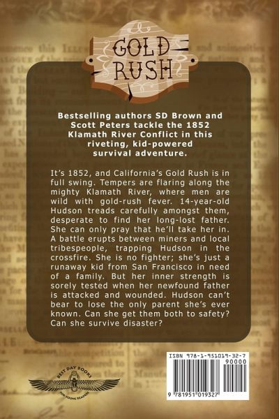 The I Escaped Series: The World's Favorite New Escapes. Survival Stories For Today's Generation Bestselling authors SD Brown and Scott Peters tackle the 1852 Klamath River Conflict in this gripping account of the 1852 Klamath River Conflict for modern young readers. It's 1852, and California's Gold Rush is in full swing. Tempers are flaring along the mighty Klamath River, where men are wild with gold-rush fever. 14-year-old Hudson treads carefully amongst them, desperate to find her long-lost father. She can only pray that he'll take her in. A battle erupts between miners and local tribespeople, trapping Hudson in the crossfire. She is no fighter; she's just a runaway kid from San Francisco in need of a family. But her inner strength is sorely tested when her newfound father is attacked and wounded. Hudson can't bear to lose the only parent she's ever known. She helps him into a dugout canoe, setting the stage for a dramatic rescue. This is the 11th children's book in the I Escaped Series about brave girls and boys who face real-world challenges and find ways to escape disaster. In 1852, the Klamath River Conflict erupted in the Wild West, a stark episode in American history. This conflict highlights the intense confrontations between Native American tribes and settlers, emblematic of the era's deep-rooted tensions and struggles for control. It highlights the resilience of the indigenous people, who faced significant challenges, while acknowledging the complex circumstances faced by all parties involved in this tumultuous period. Ideal for kids fascinated by survival stories and nature, this book delves into the unexpected dangers lurking in everyday life. Readers will experience the resourcefulness and bravery needed to face a sudden crisis. It's packed with educational insights about wildlife, safety measures, and problem-solving skills, engaging young minds with practical knowledge for real-world situations. Great for kids book clubs and classrooms--a study guide is available at https://scottpetersbooks.com/worksheets Bonus: ¿ a special section on facts about California's Gold Rush Fever that's sure to satisfy curious minds. ¿ black and white pictures bring every chapter to life ¿ includes a fun gold-panning activity to do at home or in a classroom Flesch Reading Ease: 85.6 Flesch-Kincaid Grade Level 3.2 An important, relevant read about bravery, kindness, and courage. "a must for every reading list"The I Escaped Series: The World's Favorite New Escapes. Survival Stories For Today's Generation