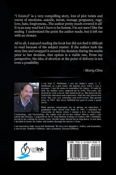 "I Existed" is a very compelling story, lots of plot twists and waves of emotions...suicide, incest, teenage pregnancy, rage, love, hate, forgiveness...The author pretty much covered it all! It is an easy read but I have to be honest, I’m not sure I like the ending I understand the point the author made, but it left me with no closure. All in all, I enjoyed reading the book but did not find it difficult to read because of the subject matter. If the author took the story line and wrapped it around the decision during the weeks prior to her decision, that option is a viable one, From my perspective, the idea of abortion at the point of delivery is not even a possibility. - Marty Cline