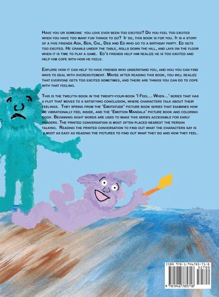 Have you or someone love ever been excited? Did you feel too excited when you saw too many fun things to do? If so, this book is for you. It is a story of a five friends Ada, Ben, Cal, Deb and Ed who go to a birthday party. Ed gets too excited. He crawls under the table, rolls down the hill, and lays on the floor when it is time to play a game. Ed's friends help him realize he is too excited and help him cope with how he feels. Explore how it can help to have friends understand you and get creative to find new things to do when you get too excited. Maybe after reading this book, you will realize that everyone gets too excited sometimes, and there are ways cope with it. This is the twelfth book in the twenty-four-book 'I Feel? When?' series that has a plot that moves to a satisfying conclusion, where characters talk about their feelings. They spring from the Emotatude' picture book series that examines how we vibrationally feel inside, and the Emotion Mandala picture book and coloring book. Beginning sight words are used to make this series accessible for early readers. The printed conversation is most often placed nearest the person talking. Reading the printed conversation to find out what the characters say is almost as easy as reading the pictures to find out what they do and how they feel.