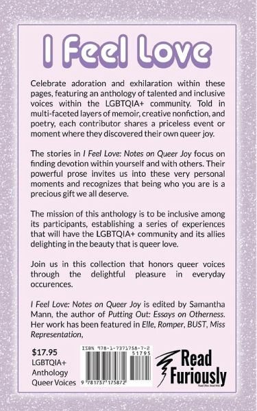 Celebrate adoration and exhilaration within these pages, featuring an anthology of talented voices within the LGBTQIA+ community. Told in multi-faceted layers of memoir, creative nonfiction, and poetry, each contributor shares a priceless event or moment where they discovered their own queer joy. The stories in I Feel Love: Notes on Queer Joy focus on finding devotion within yourself and with others. Their powerful prose invites us into these very personal moments and recognizes that being who you are is a precious gift we all deserve. The mission of this anthology is to be inclusive among its participants, establishing a series of experiences that will have the LGBTQIA+ community and its allies delighting in the beauty that is queer love. Join us in this collection that honors queer voices through the delightful pleasure in everyday occurrences. I Feel Love: Notes on Queer Joy is edited by Samantha Mann, the author of Putting Out: Essays on Otherness. Her work has been featured in Elle, Romper, BUST, Miss Representation, and The Audacity.