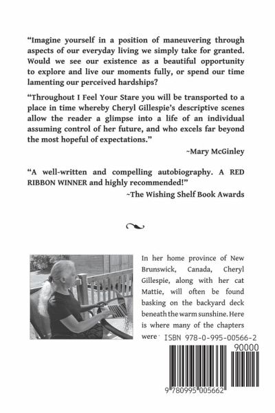 "Imagine yourself in a position of maneuvering through aspects of our everyday living we simply take for granted. "Would we see our existence as a beautiful opportunity to explore and live our moments fully, or spend our time lamenting our perceived hardships? "Throughout "I FEEL YOUR STARE," you will be transported to a place in time whereby Cheryl Gillespie's descriptive scenes allow the reader a glimpse into a life of an individual assuming control of her future, and who excels far beyond the most hopeful of expectations." ~Mary McGinley