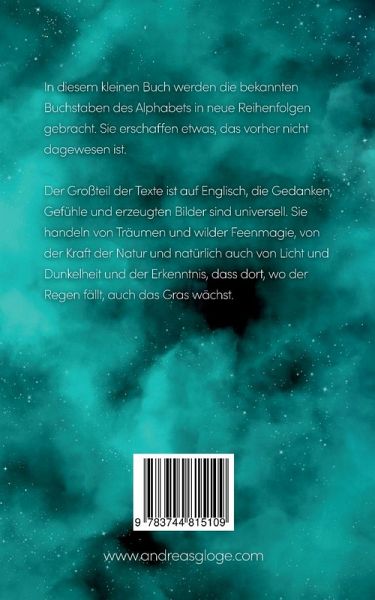 In diesem kleinen Buch werden die bekannten Buchstaben des Alphabets in neue Reihenfolgen gebracht. Sie erschaffen etwas, das vorher nicht dagewesen ist. Der Großteil der Texte ist auf Englisch, die Gedanken, Gefühle und erzeugten Bilder sind universell. Sie handeln von Träumen und wilder Feenmagie, von der Kraft der Natur und natürlich auch von Licht und Dunkelheit und der Erkenntnis, dass dort, wo der Regen fällt, auch das Gras wächst.